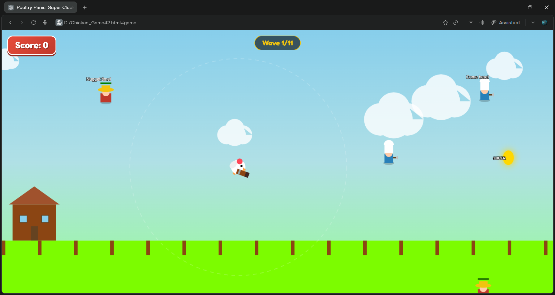 In Poultry Panic: Super Cluck, you take control of the farm's bravest chicken. Survival isn't just about avoiding the deep fryer—itโs about turning the tables on the hungry farmers!